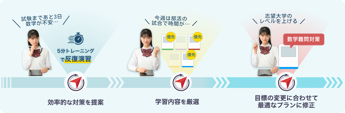 高校生コースでは、「戦略AIコーチ」が①志望大学、②テストの目標点数、③頑張りたい科目、④確保できる学習時間などをヒアリング。毎日適切な学習プランを作成し、今やるべき教材を提案することで、志望大学合格へ導きます。小テストや部活動の試合、アルバイトなど急な予定変更で学習が思うように進められないときは、戦略AIコーチが目標達成に向けて学習プランを立て直すため、集中して学習に取り組むことができます。