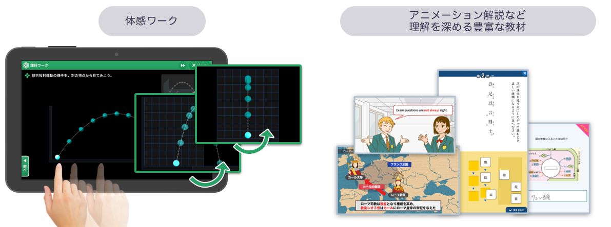 また、自分でグラフの変数を操作したり、バーチャル実験をしたりすることで、複雑な概念を直感的に理解できる「体感ワーク」や、新しい概念・現象を学ぶときに視覚的な理解を促す「アニメーション解説」により、理科や数学、歴史など各教科の理解を深めます。1講座15分を目安に設定されているため、登校前などのスキマ時間に取り組める教材も多く、忙しい毎日でも着実に学力を上げていくことができます。