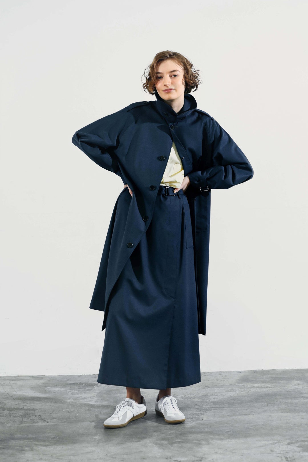 素材はウールギャバジンのオリジナルファブリックを使用。ギャバジン織を通常より細い糸で織り込むことで、しなやかなドレープ性があります。同素材のスカート『BALCOMBE SKIRT(バルカムスカート)』も含めて、ジェンダーレスで着られるベーシックなカラーリングです。