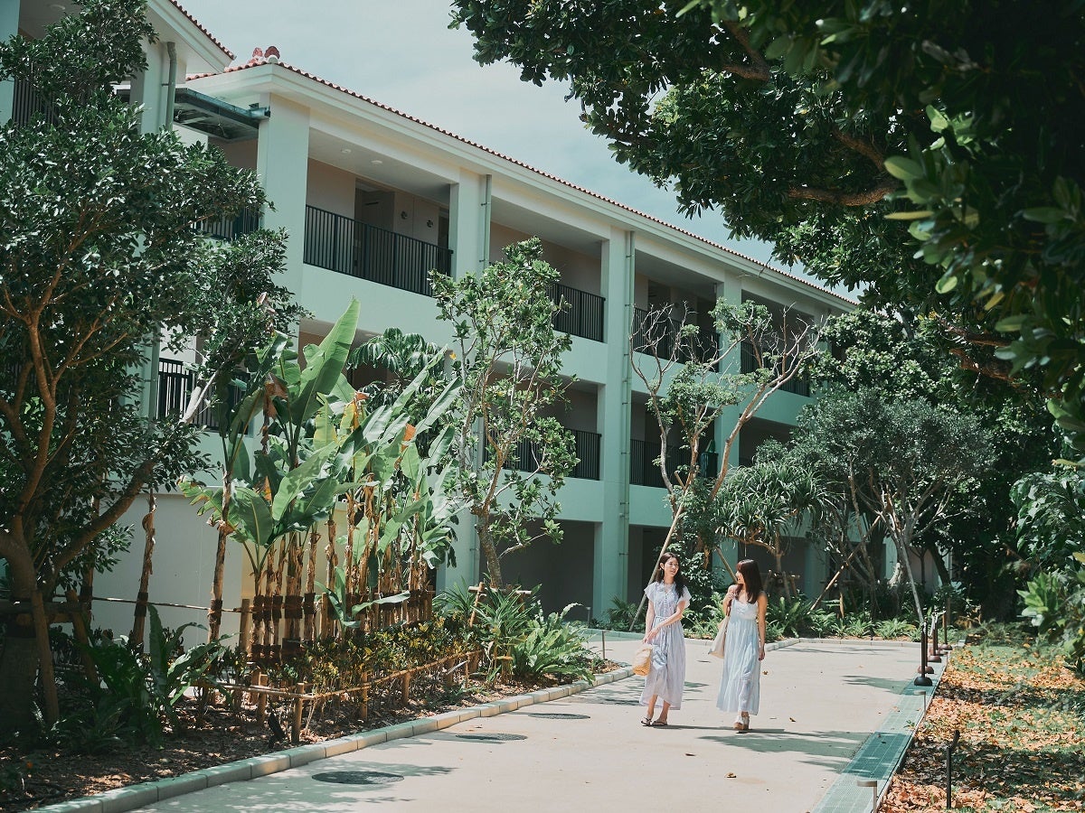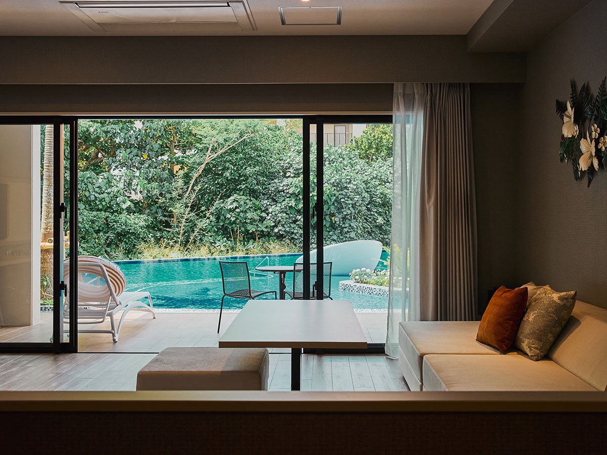 全客室50m²以上のオールスイートルーム。全室キッチン、各種家電、Wi-Fi完備。OceanWingの1階客室にはプライベートプールを完備。