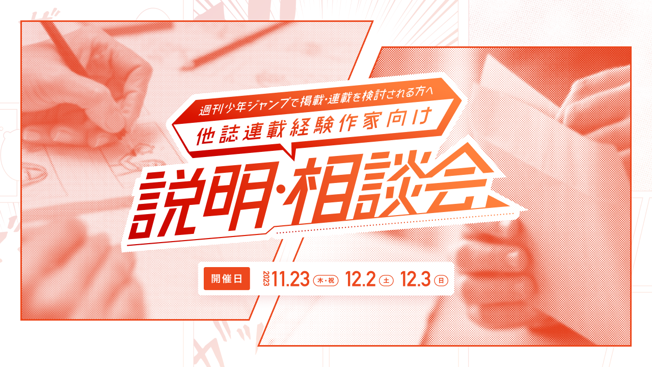 「週刊少年ジャンプ」編集部(株式会社集英社)は、「週刊少年ジャンプ」での読切掲載・連載を検討されているプロの作家(他誌での連載経験者)を対象に説明・相談会を開催します。