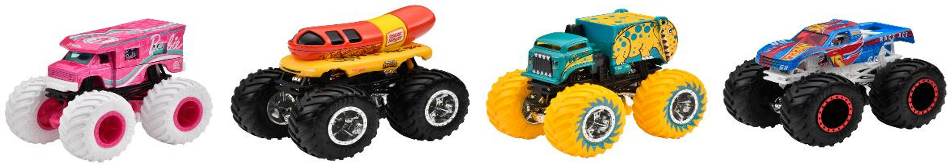 大きなタイヤが特徴の1/64のモンスタートラックの新アソートです。今回のアソートには、「バービー - アルティメイト・キャンパー」やトゥクトゥクをイメージした「タックンロール」を含む全8車種がラインアップしています。また、モンスタートラックでクラッシュできる車も1台付いてきます。
