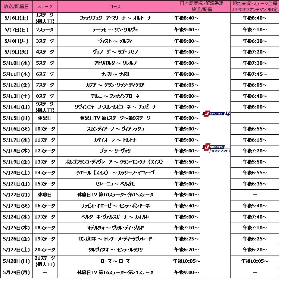 スポーツテレビ局、株式会社ジェイ・スポーツ(本社 東京都江東区、代表取締役社長 長谷 一郎、以下「J SPORTS」 ※1)は、5月6日(土)に開幕する第106回ジロ・デ・イタリアの全21ステージと、休息日に前週のレースを振り返る休息日TVを生中継します。また、PC、スマホ、タブレットで見られる 「J SPORTSオンデマンド」※2 では全21ステージのLIVE配信に加え、現地実況・解説(英語)にて全ステージの全行程をスタートからフィニッシュまでLIVE配信します。第1ステージは、より多くのサイクルロードレースファンの皆さまにグランツール初戦 ジロ・デ・イタリアの素晴らしさをお届けするため、J:COM及び一部のケーブルテレビ局※3 、スカパー!で無料放送、 J SPORTSオンデマンドで無料LIVE配信※4 します。また、J SPORTSサイクルロードレース公式YouTubeチャンネルでも無料LIVE配信します。