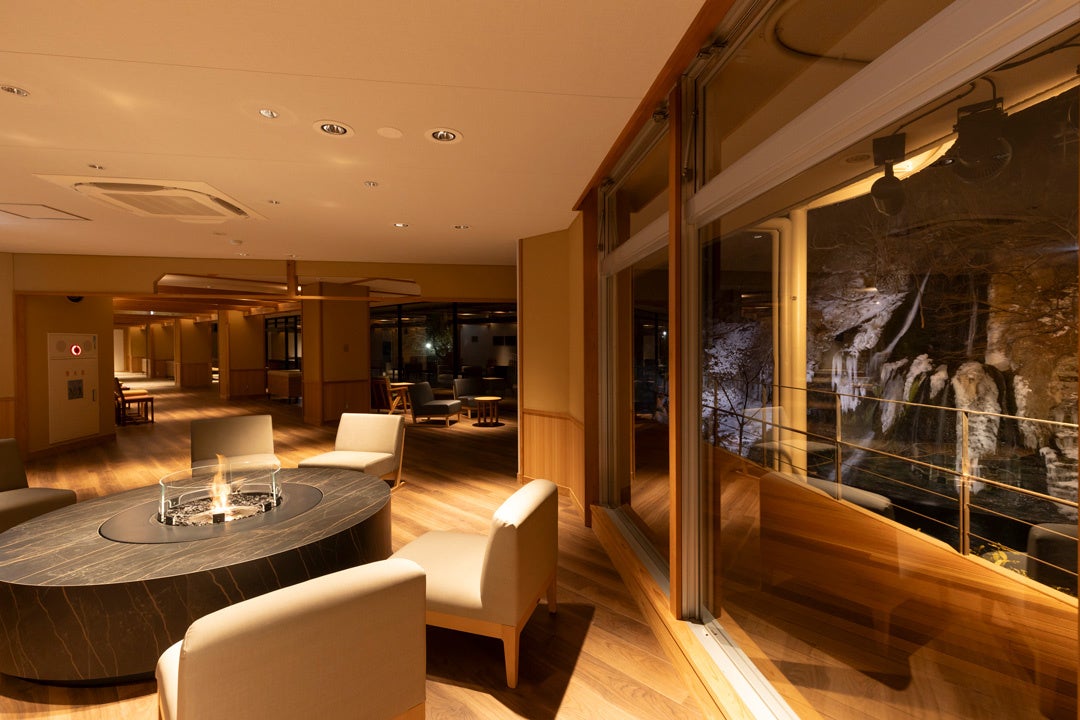 新設したプレミアムラウンジ(通称:滝見ラウンジ)は、館内で最も景観が良い場所に位置し、七絃の滝の雄大な景色をお楽しみいただけます。四季折々に表情を変えるロケーションは、何度お越しいただいても飽きない、贅沢なひと時をご堪能いただけます。さらに、夜間はライトアップされるため、昼とは違った幻想的な姿をご覧いただけます。ご滞在中はソフトドリンクや生ビールなどのアルコール類を何度でも無料でお楽しみいただけます。
