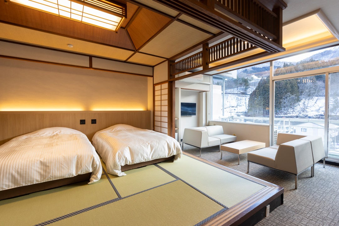 一部の客室を人気の和モダンルームにリノベーションいたします。就寝時はベッドの利便性を、くつろぎ時間は畳で思いきり手足を伸ばせる快適性を兼ね備えています。