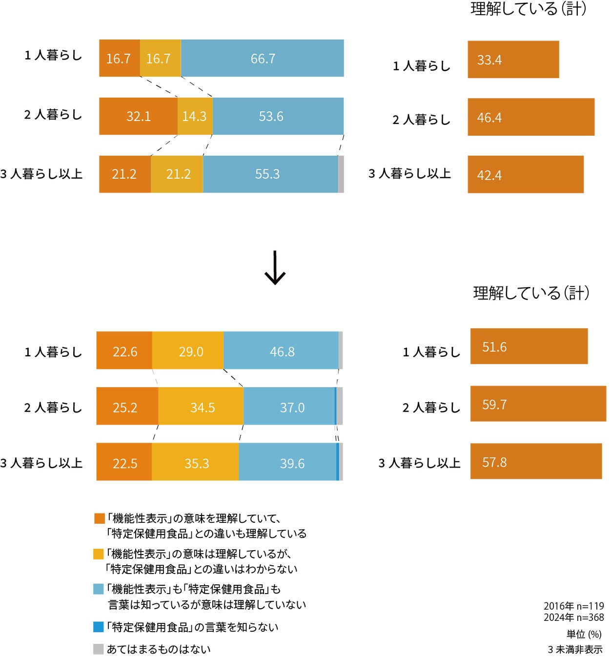 また、『2人暮らし』では他の世帯構成と比べ、『理解している(計)』の内訳で異なった傾向となりました。「特定保健用食品」との違いを理解している方が約7pt減少し、「特定保健用食品」との違いも理解していない方が約20pt増加しました。