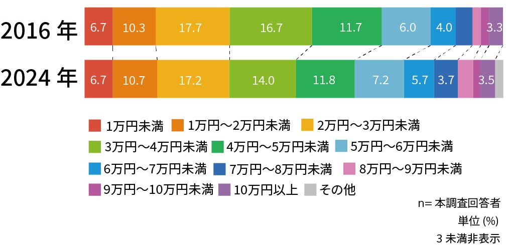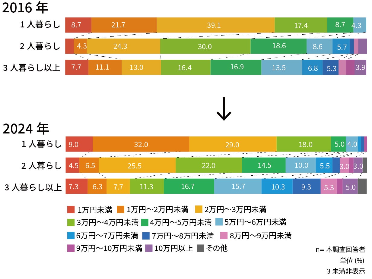 『3人暮らし以上』で減少している区分が多いです。特に、「1万円未満」から「4万円~5万円未満 」までの区分で全て減少しており、「1万円~4万円未満 」の各区分はそれぞれ約5pt減少しました。