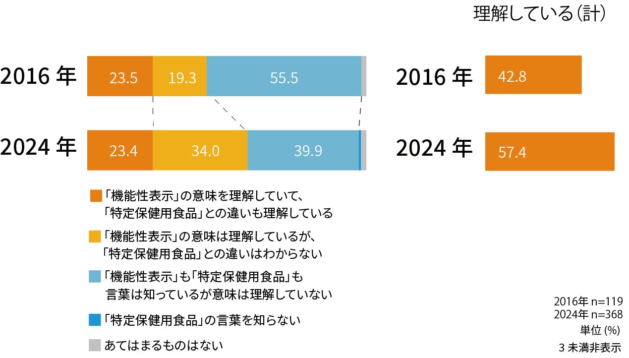 『理解している(計)』が約15pt増加していることから、「機能性表示」の理解も広まっている傾向にあります。