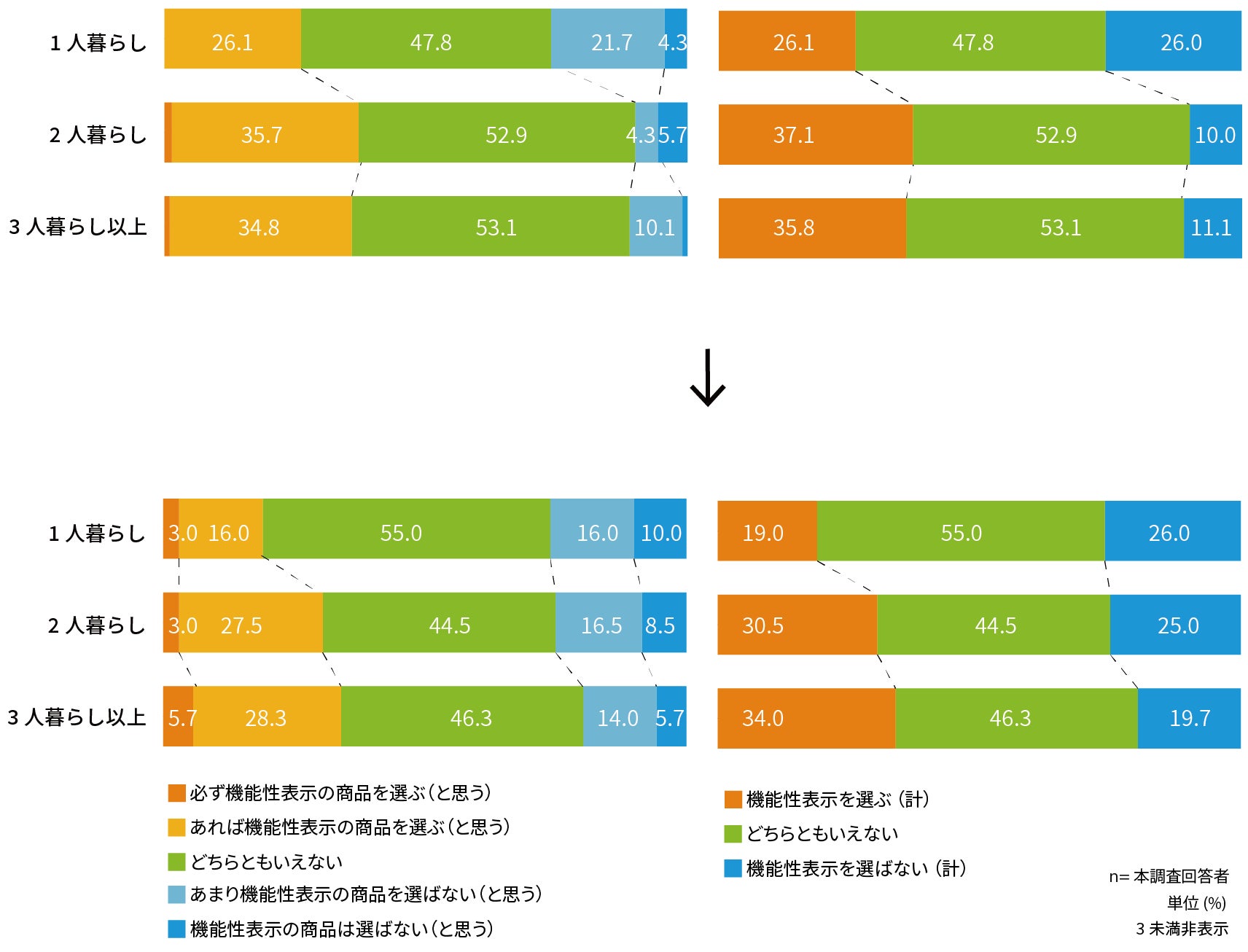 どの世帯構成でも「「機能性表示」も「特定保健用食品」も言葉は知っているが意味は理解していない」が約15pt~20pt減少しております。一方で、「「機能性表示」の意味は理解しているが、「特定保健用食品」との違いはわからない」が約12pt~20pt増加しました。