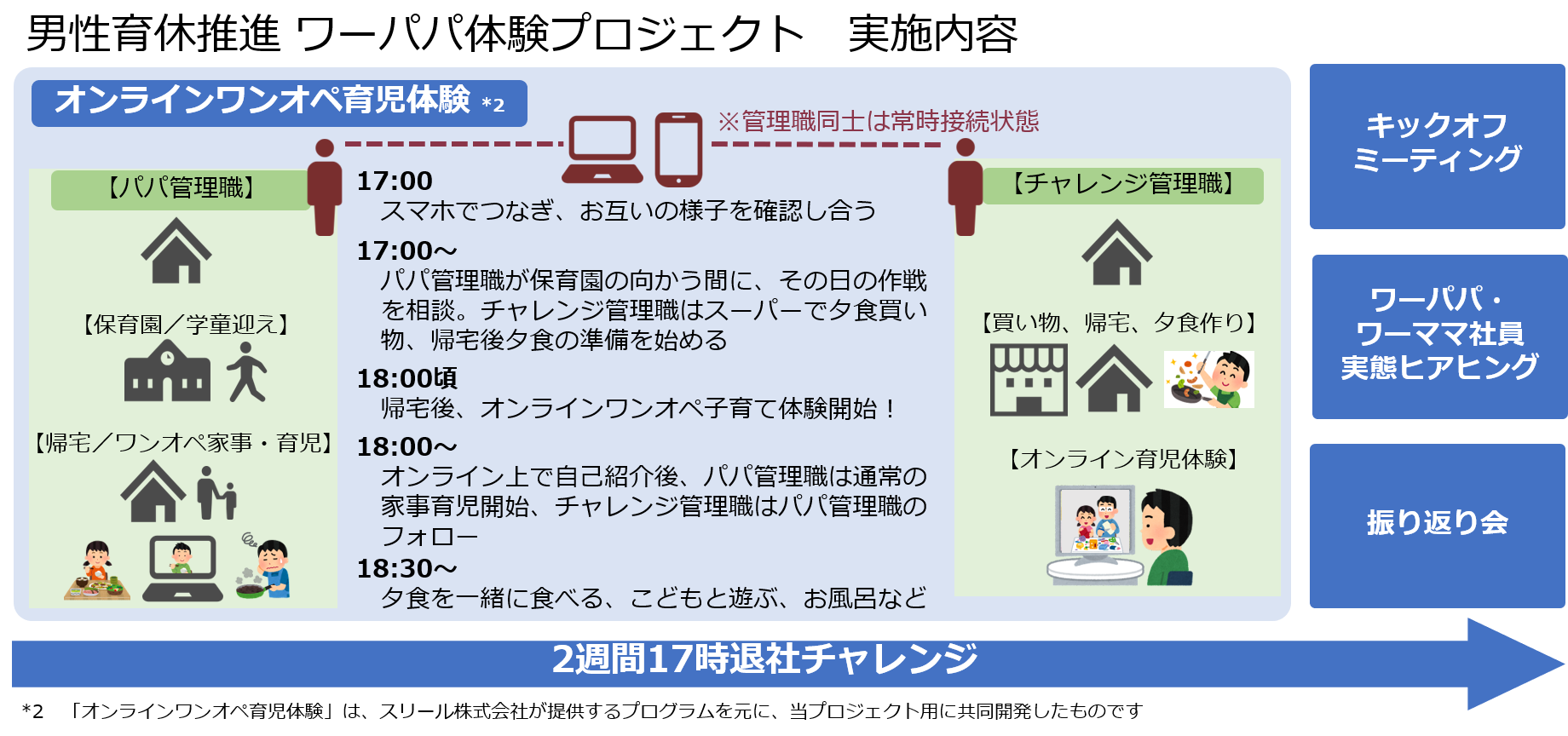 当プロジェクトでは、育児中の家庭のリアルを知り体験する「オンラインワンオペ育児体験」や、育休取得の経験がある男性社員をはじめとした社員の赤裸々な声を聞く「ワーパパ・ワーママ社員実態ヒアリング」などを行います。尚、プロジェクトに参加する管理職は、プロジェクト実施期間の約2週間、通常業務を必ず17時で切り上げる「時間制約のある働き方」を通じて、「時間に対する焦りや苛立ち」「やりたいのにできないジレンマ」などを体感することにより、組織全体の働き方改善や仕事の仕組み化の必要性を理解し、自身の働き方やマネジメントを見直す機会につなげることも狙いとしています。