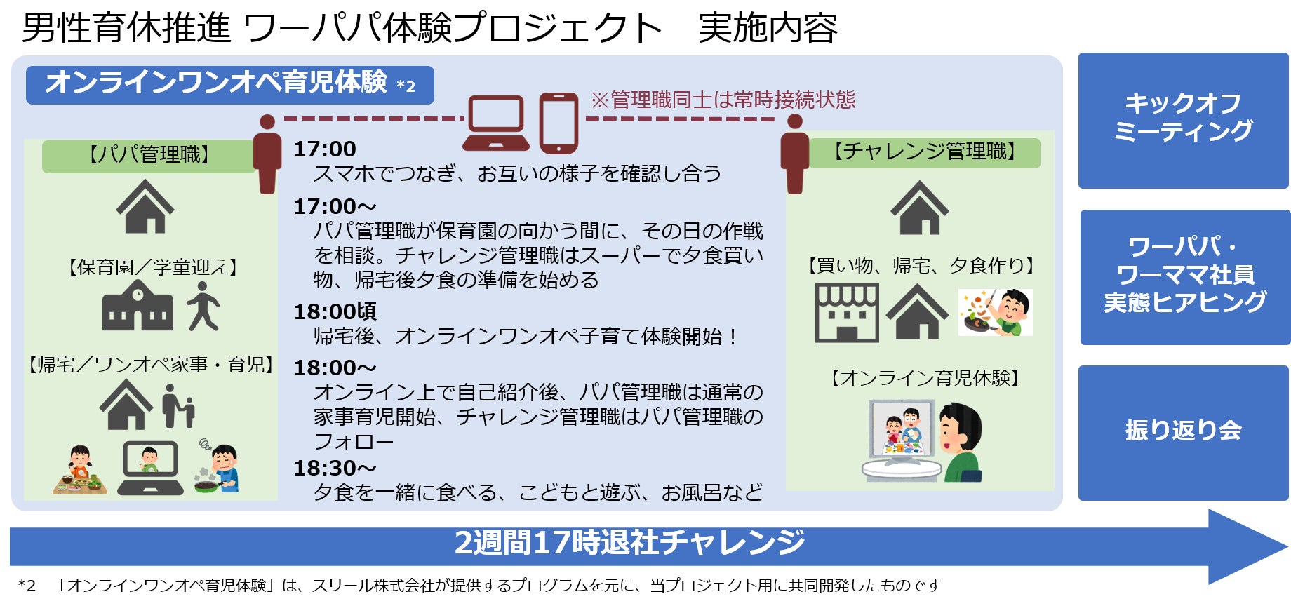 そこで今回のプロジェクトでは、「2週間17時退社チャレンジ」を通して、管理職自身が時間制約のある働き方を体験することで、組織全体での働き方改善や仕事の仕組化の必要性を理解し、今後の自身の働き方やマネジメントを見直す機会にすることを目指します。また、「オンラインワンオペ育児体験」や、悩み葛藤しながら育児と自身のキャリア形成を両立する「ワーパパ、ワーママ社員実態ヒアリング」を通して、管理職自身が「ライフの中でキャリアを形成していく」必要性と育休取得の意義やメリットを感じることにより、男女問わず育休が取得しやすい風土作りを加速させていきます。