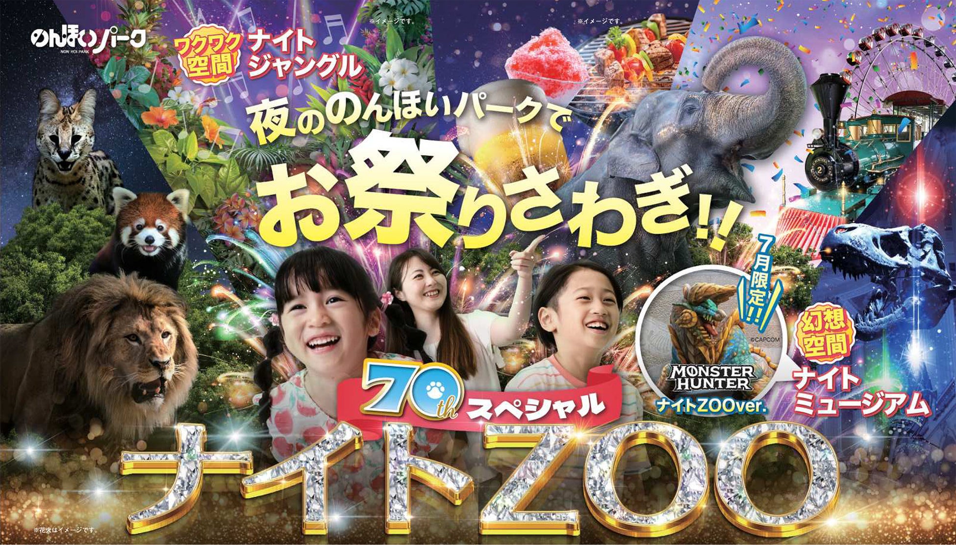 乗り放題の遊園地や、ナイトZOO探検キット(有料)、モンハンコラボなど広大な動植物園全体が、夜ならではのワクワクドキドキを70周年のスペシャル仕様でお届けします!