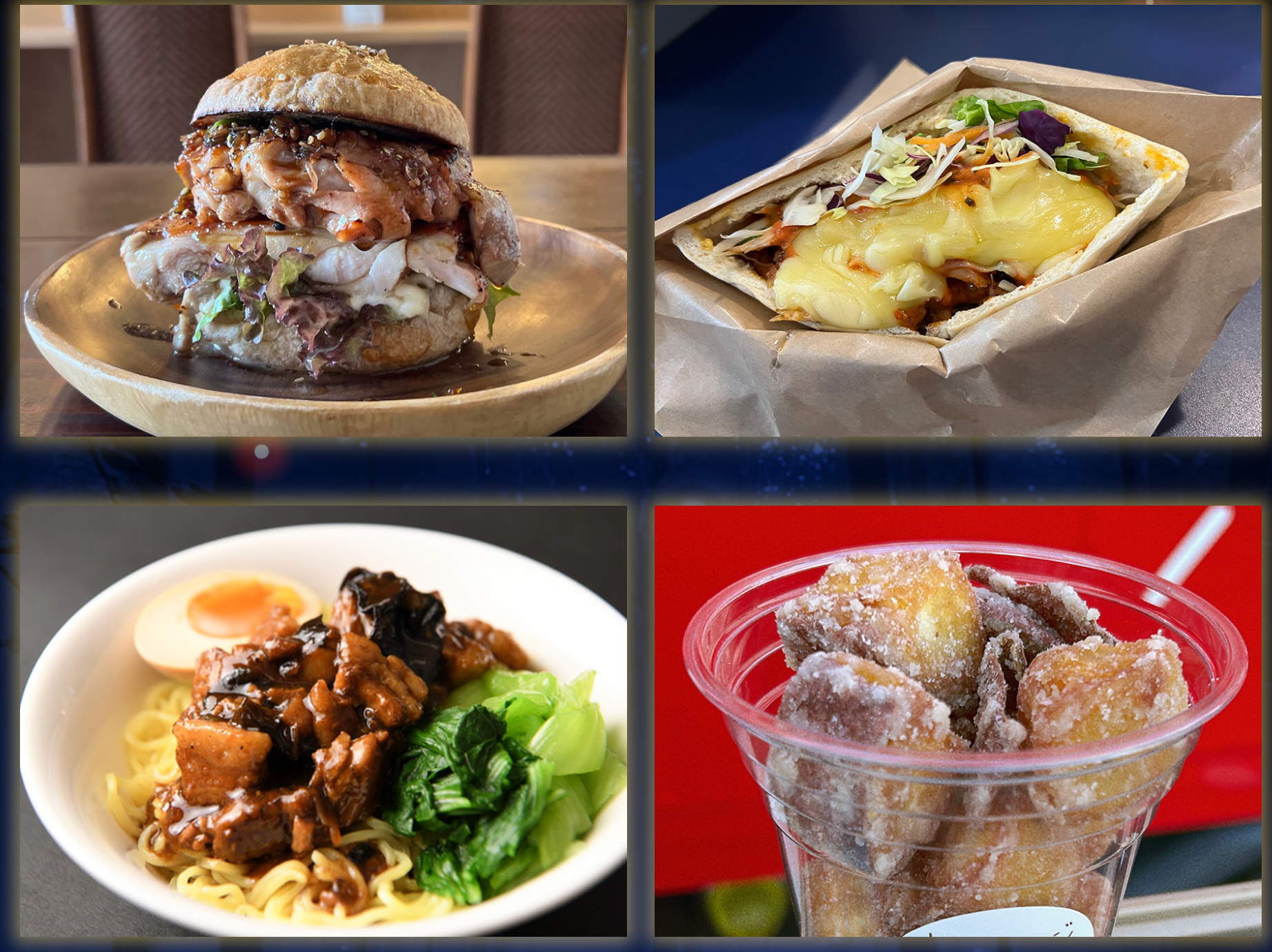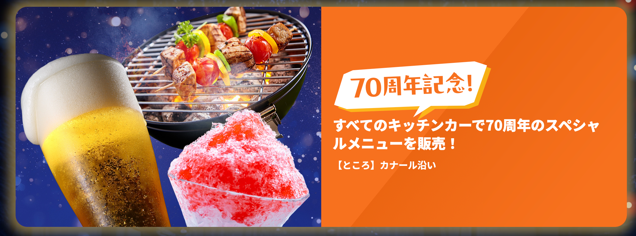 水路沿いの通路にずらっとキッチンカーが並ぶグルメエリア!なんと今年はのんほいパーク70周年特別企画として、全てのキッチンカーで”70周年スペシャルグルメ”がラインナップ!