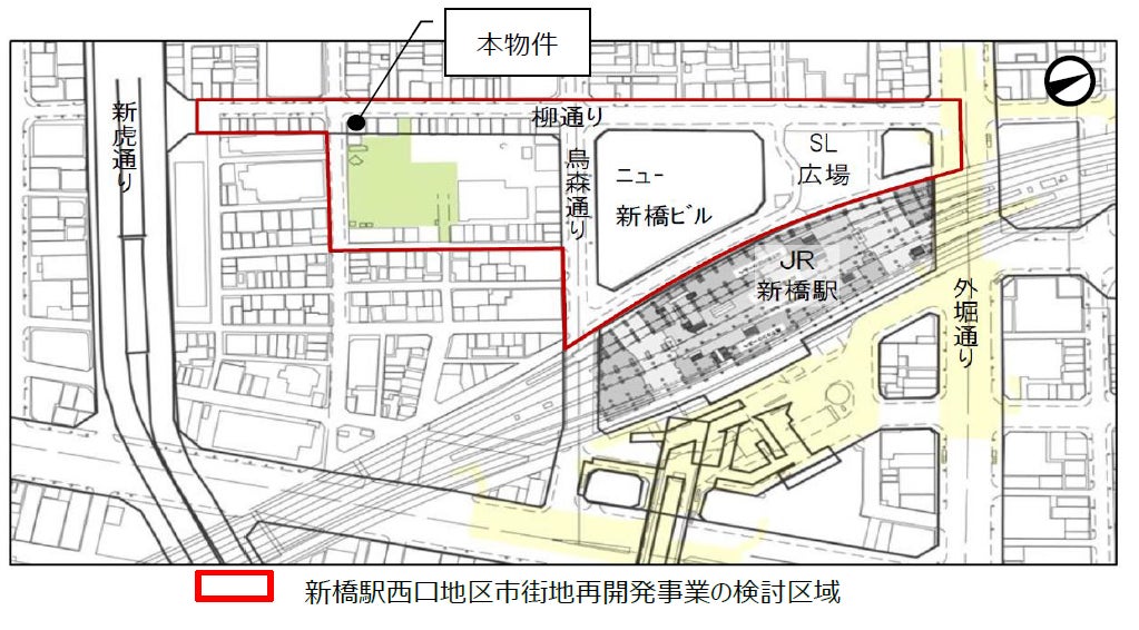 本事業は、新橋駅西口に位置するSL広場、ニュー新橋ビル(昭和46年2月竣工)及び隣接する新橋三丁目・四丁目の一部エリアを含む約2.8haが検討区域となっております。今後も事業協力者として事業推進における協力・支援を行ってまいります。