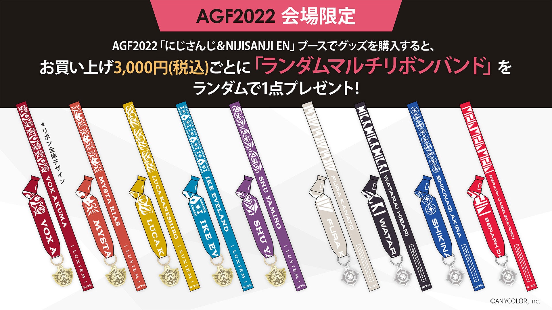 AGF2022「にじさんじ&NIJISANJI EN」ブースでグッズを購入すると、お買い上げ3,000円(税込)ごとに「ランダムマルチリボンバンド(全9種)」をランダムで1点プレゼントいたします。