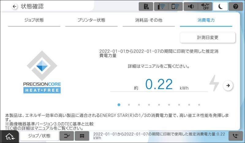 ※4: 推定消費電力量を表示します。表示電力量は一般的な使用の目安値であり、本製品の使用方法によって異なる場合があります。右記の計算式で計算されます。<本製品で用紙1枚に印刷をするために必要となる電力量>×<過去7日間に印刷した枚数>