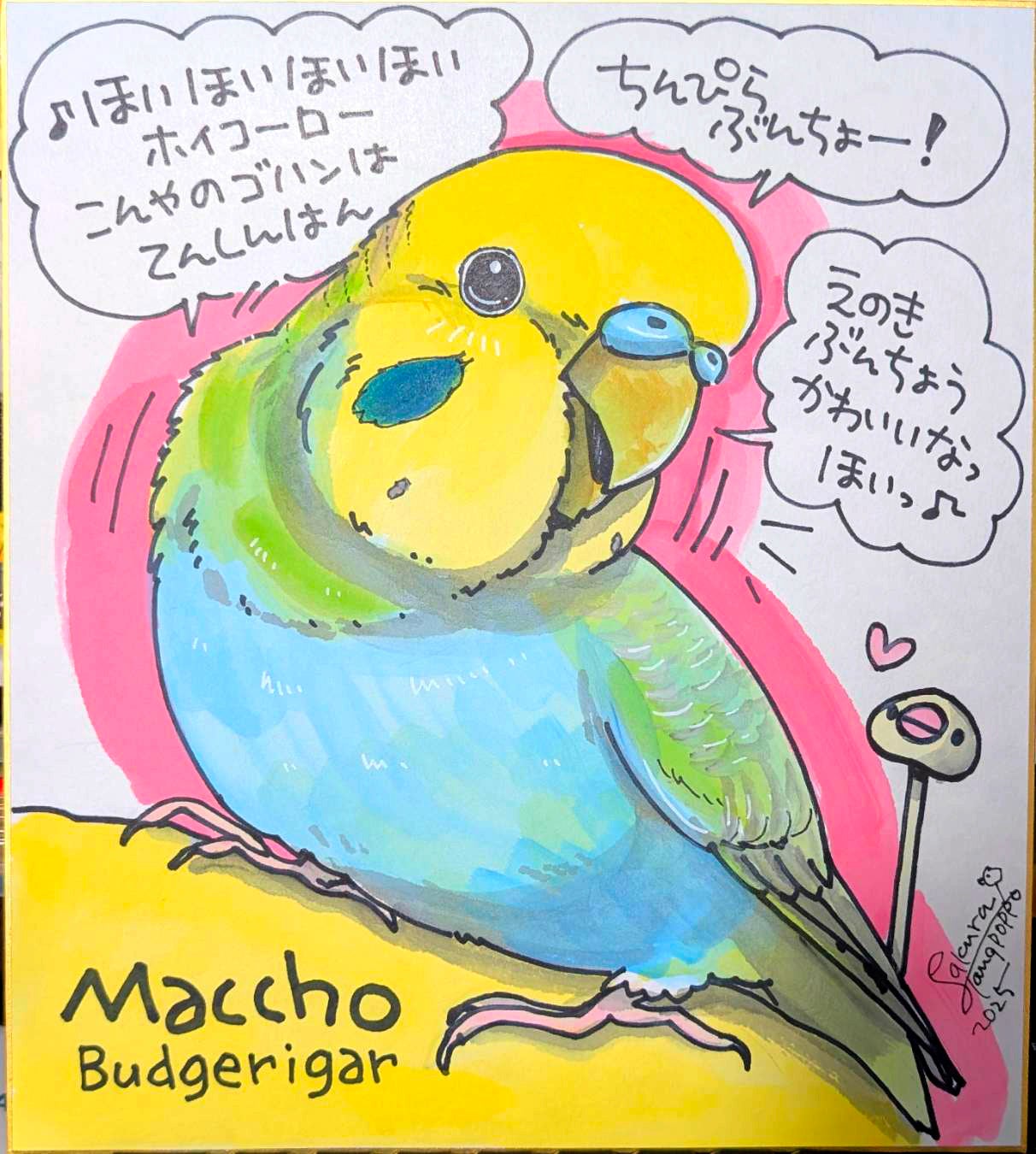 写真を見ながらキャンバス生地のバッグや色紙に目の前で描き、すぐにお持ち帰りいただけます。鳥以外の動物も、人物も承ります。