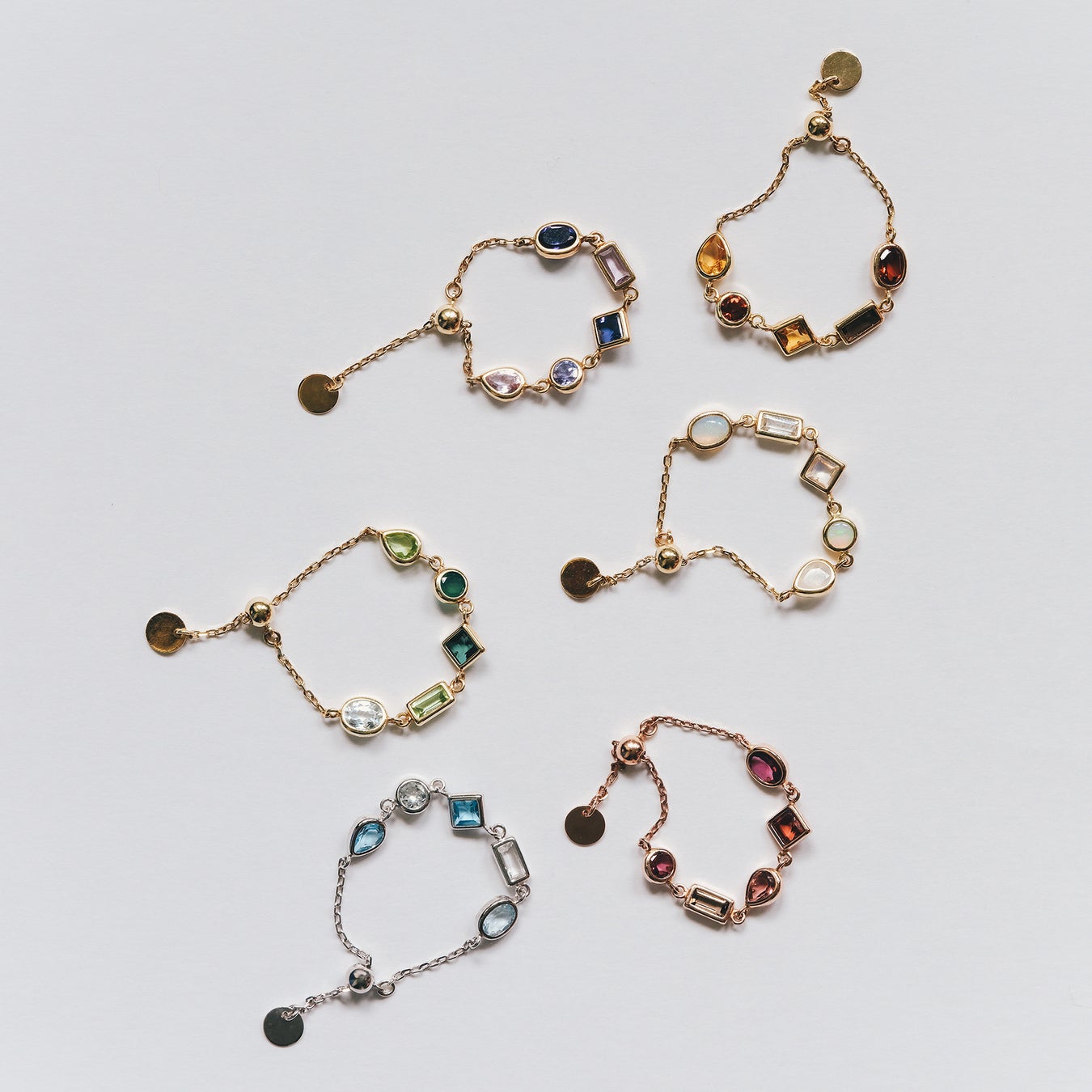 カラフルな宝石がまるでモザイクアートのような[jewel mosaic]シリーズ。カラーストーンは5つのシェイプの石を組み合わせ、それぞれを細いK10のラインで縁取り、かわいらしさの中にもキリッとした印象をプラス。