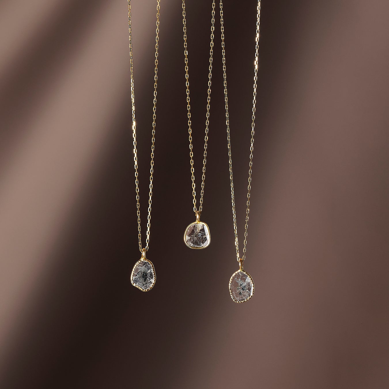 ダイヤモンドの原石を薄くスライスして磨き上げた「スライスダイヤモンド」。内包物や形が異なりひとつとして同じものはないダイヤモンドをデザイナーがセレクトし、インドの職人がひとつひとつ金で取り巻きました。湖に薄く張った氷のように、水面が日の光で輝くように、面できらっと輝くスライスダイヤモンドの美しさを堪能できるネックレスです。