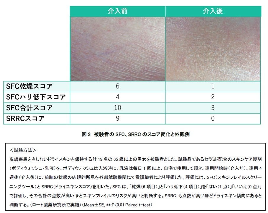 結果1 セラミド配合スキンケア製剤の使用で、ドライスキンを有する高齢者のSFCスコア、SRRCスコアが有意に低下した