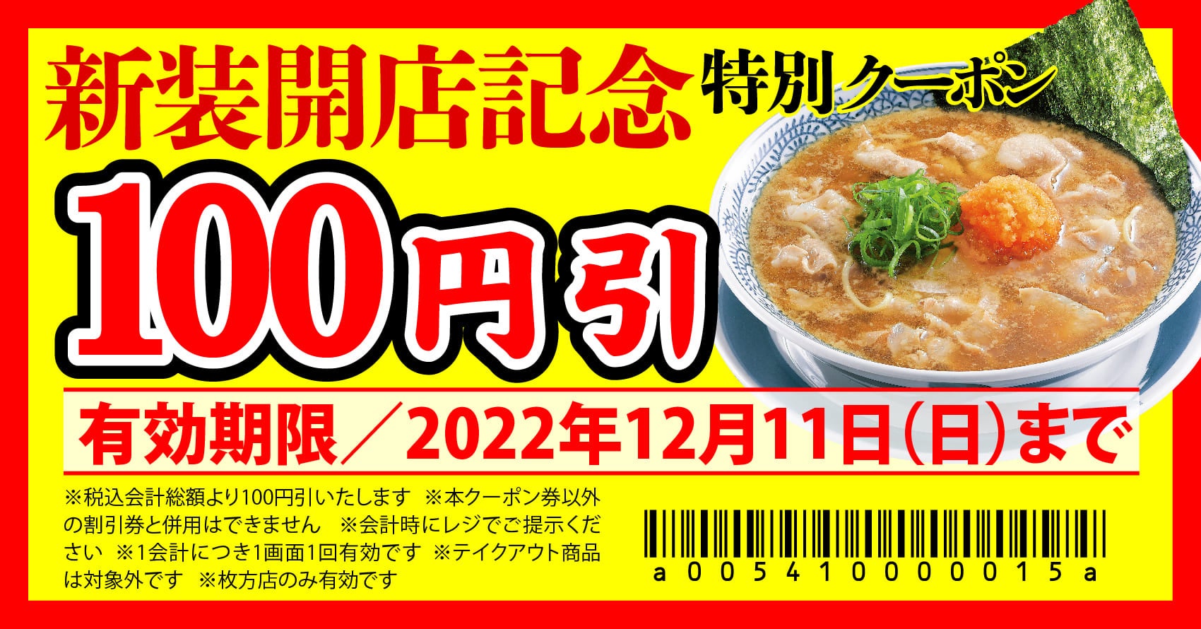 リニューアル記念として、2022年12月11⽇(日)まで『丸源ラーメン 枚方店』のみでご利⽤いただける100円引クーポンを配布します。