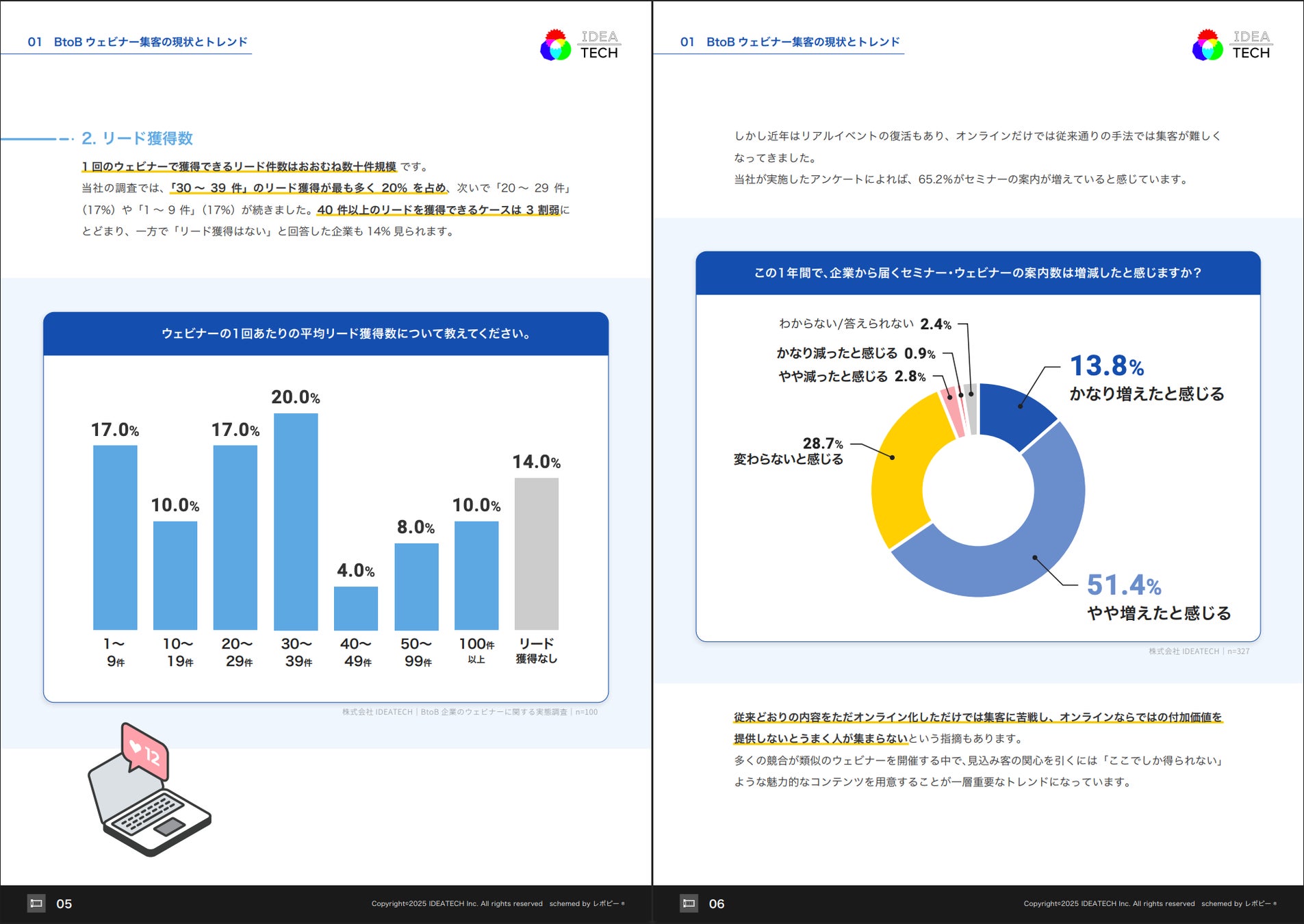BtoB企業のマーケティングにおいて、ウェビナーやセミナーは重要なリード獲得手段として8割以上の企業が実施していますが、その一方で65.2%が「セミナー案内が増えた」と感じており、集客競争が激化しています。