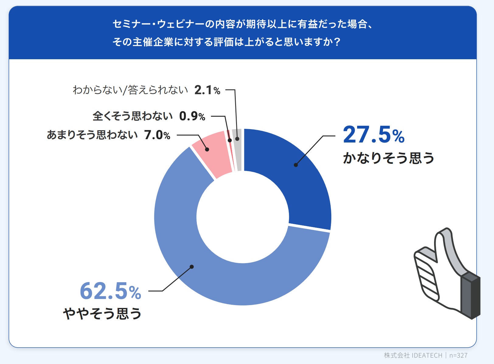 一方で、90%が「有益な内容だった場合、企業評価は上がる」と回答しており、コンテンツの質が集客力と企業ブランドを大きく左右することが明らかになりました。