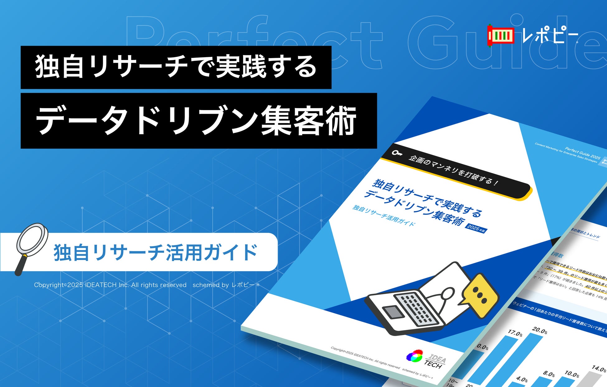 ワンストップでレポートマーケティングを実現する「レポピー®️」(https://ideatech.jp/service/report-pr)を提供する株式会社IDEATECH(本社:東京都港区、代表取締役社長:石川友夫)は、パーフェクトガイド「独自リサーチで実践するデータドリブン集客術」を無料公開しました。