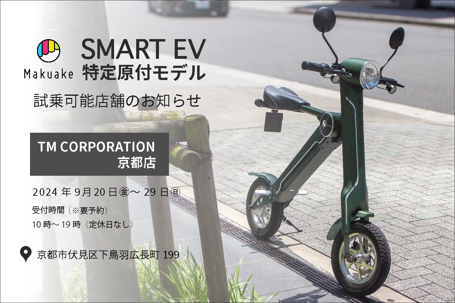 株式会社ブレイズ(愛知県名古屋市、代表取締役:市川秀幸、以下ブレイズ)は、Makuake応援購入プロジェクトにて先日発売した「16歳以上免許不要」の新商品:スマートEV 特定原付モデルが、弊社正規ディーラーの「TM CORPORATION 京都店/吉田商事株式会社」(京都府京都市、代表取締役:吉田隆)にて、9月20日(金)~29日(日)までご試乗いただけますことをお知らせいたします。