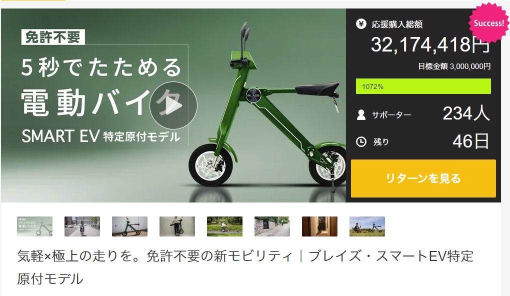 プロジェクトスタート1時間で目標金額を達成し、9月17日(火)現在3,200万円を突破した注目の電動バイクとなっております。近郊にお住いのお客様におかれましては、せひこの機会に、「スマートEV特定原付モデル」をご体感ください!