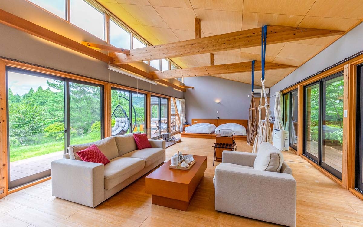 5棟のヴィラの中でも、特におすすめなのが「星降る丘」です。広大な敷地を一望できる高台に位置するこのプライベートヴィラは、専用のゴルフホールを備えており、ウッドデッキからそのまま打ちっぱなしを楽しむことができます。さらに、大自然の中でセルフロウリュを楽しめるバレルサウナも完備されており、非日常空間の中で心身ともに癒される贅沢な時間をお楽しみいただけます。