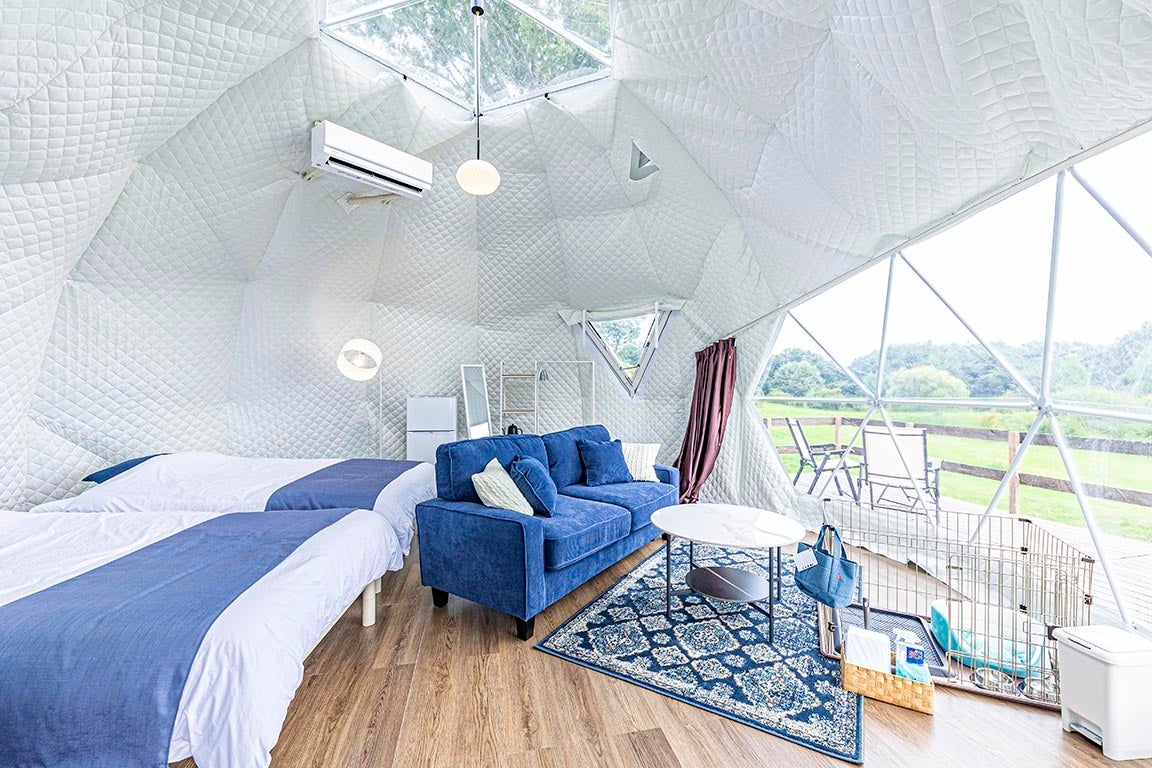 自然に溶け込む丸くて可愛いドームテントのお部屋は、インテリアにもこだわり、グランピングならではの非日常空間を演出します。エアコン完備でオールシーズン快適な室内からは、山々から昇る陽日を眺め、時間とともに刻々と変化する空の色をゆったりと楽しむことができます。