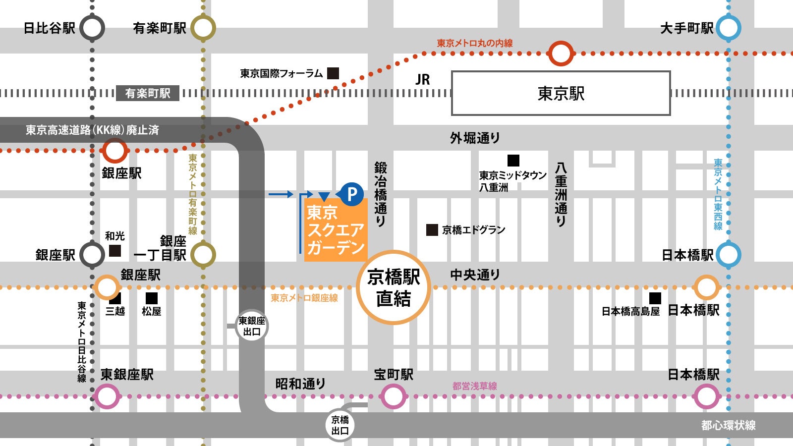 東京メトロ銀座線「京橋」駅直結、東京メトロ有楽町線「銀座一丁目」駅徒歩2分 都営地下鉄浅草線「宝町」駅徒歩2分 JR「東京」駅徒歩6分、JR「有楽町」駅徒歩6分 |