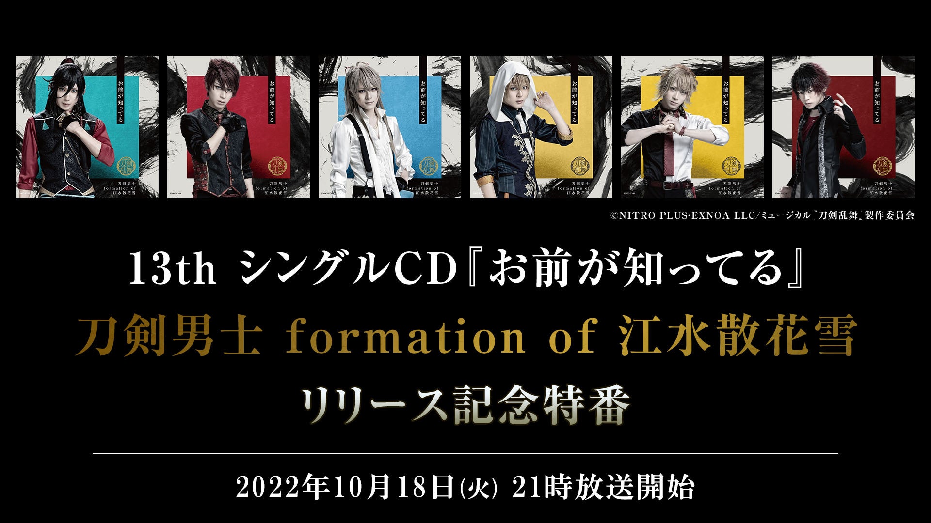 ニコ生【ミュージカル『刀剣乱舞』】10/18(火)に13th シングルCD『お前が知ってる』刀剣男士 formation of 江水散花雪のリリース記念特番が決定