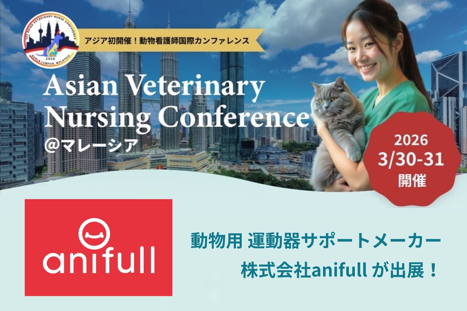 医療用品メーカーのダイヤ工業株式会社(本社:岡山県岡山市 代表取締役:松尾浩紀)のグループ企業である、動物用サポーターメーカーの株式会社anifull(本社:岡山県岡山市 代表取締役:川田修司)は、2026年3月30日(月)・31日(火)にマレーシア・クアラルンプールで開催される「第1回アジア動物看護師国際カンファレンス(AVNC 2026)」に出展いたします。本出展を通じて、アジア全域の獣医療関係者にanifullの製品を広め、国境を越えたペットケアの質の向上を目指します。