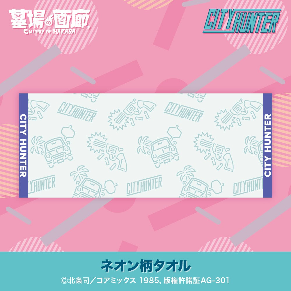 タイトルロゴはもちろん、獠の愛銃コルト・パイソンと愛車のミニクーパー、そして車の窓からはおなじみの100トンハンマーをネオン風にデザインしたタオルだ!