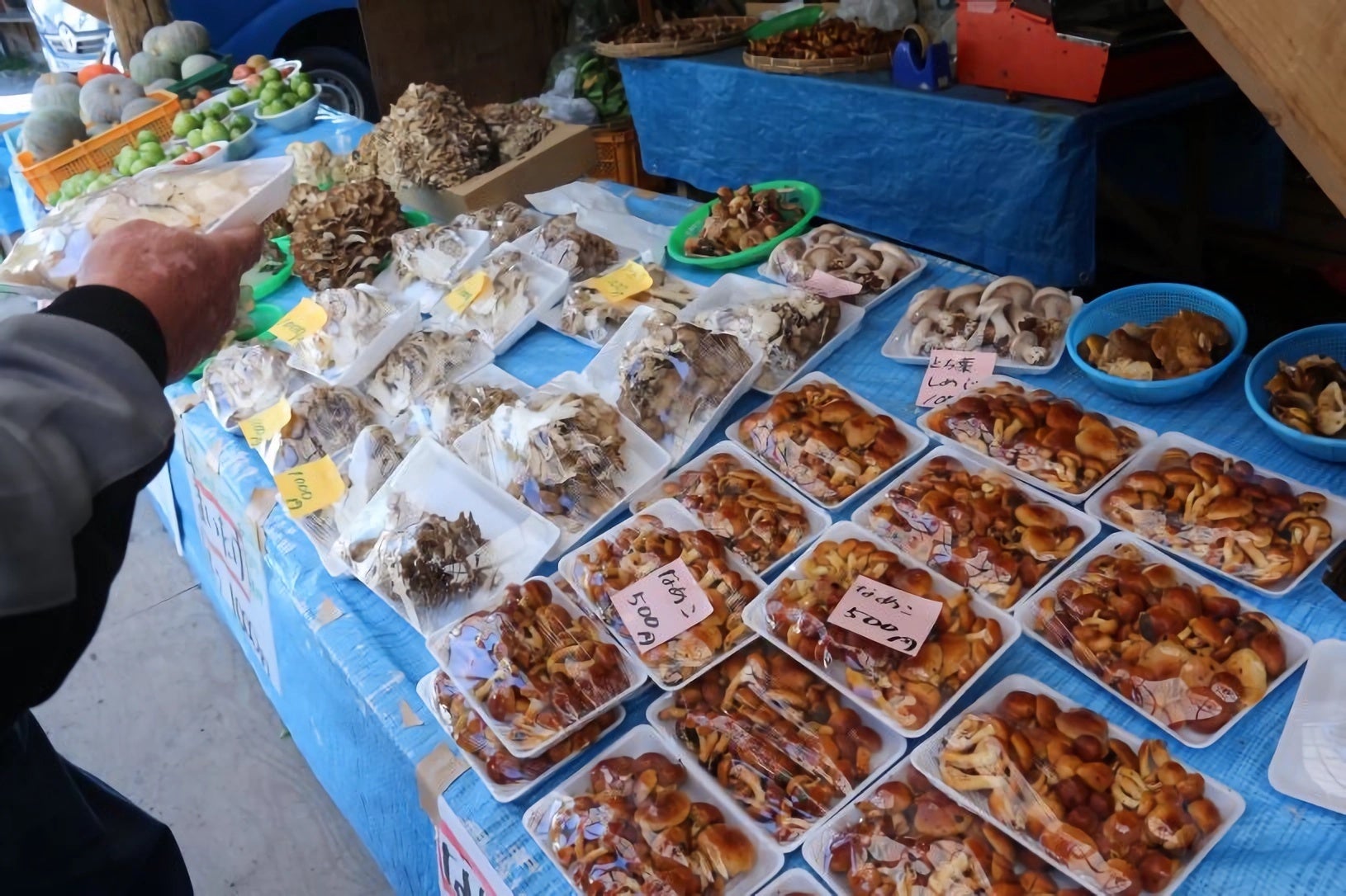 農家が直接開く直売所では、鮮度良好な農産物を、安心の低価格で買えると大人気。紅葉が見ごろをむかえる頃には、地元で採れたナメコやシモフリシメジ、クリタケやシシタケ(香茸)など、多種類のキノコが並び、沢山の観光客が紅葉ドライブの途中に寄られます。