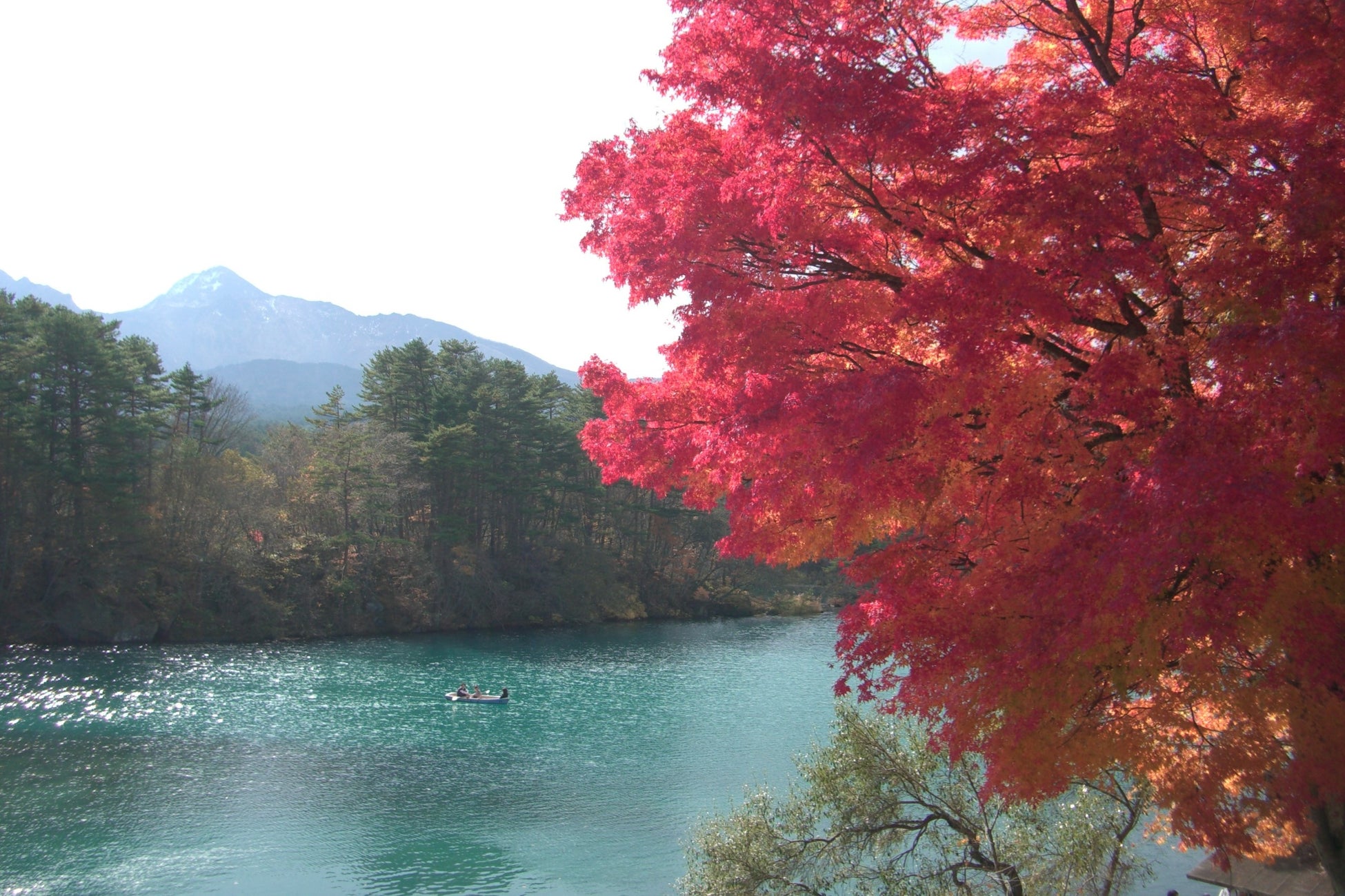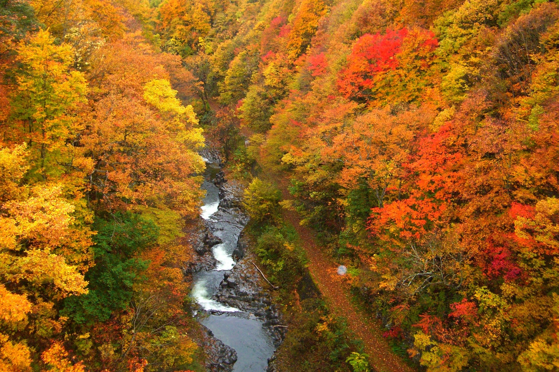 磐梯山の噴火で生まれた桧原湖、小野川湖、秋元湖の湖沼を眺めながら林の中を走る磐梯吾妻レークライン。磐梯山の紅葉と三湖が織りなす大パノラマを体験できます。一番の見所である中津川渓谷は、広葉樹林が織りなす素晴らしい色彩が楽しめ、渓谷までの遊歩道をのんびり歩くことができる裏磐梯随一の紅葉名所です。