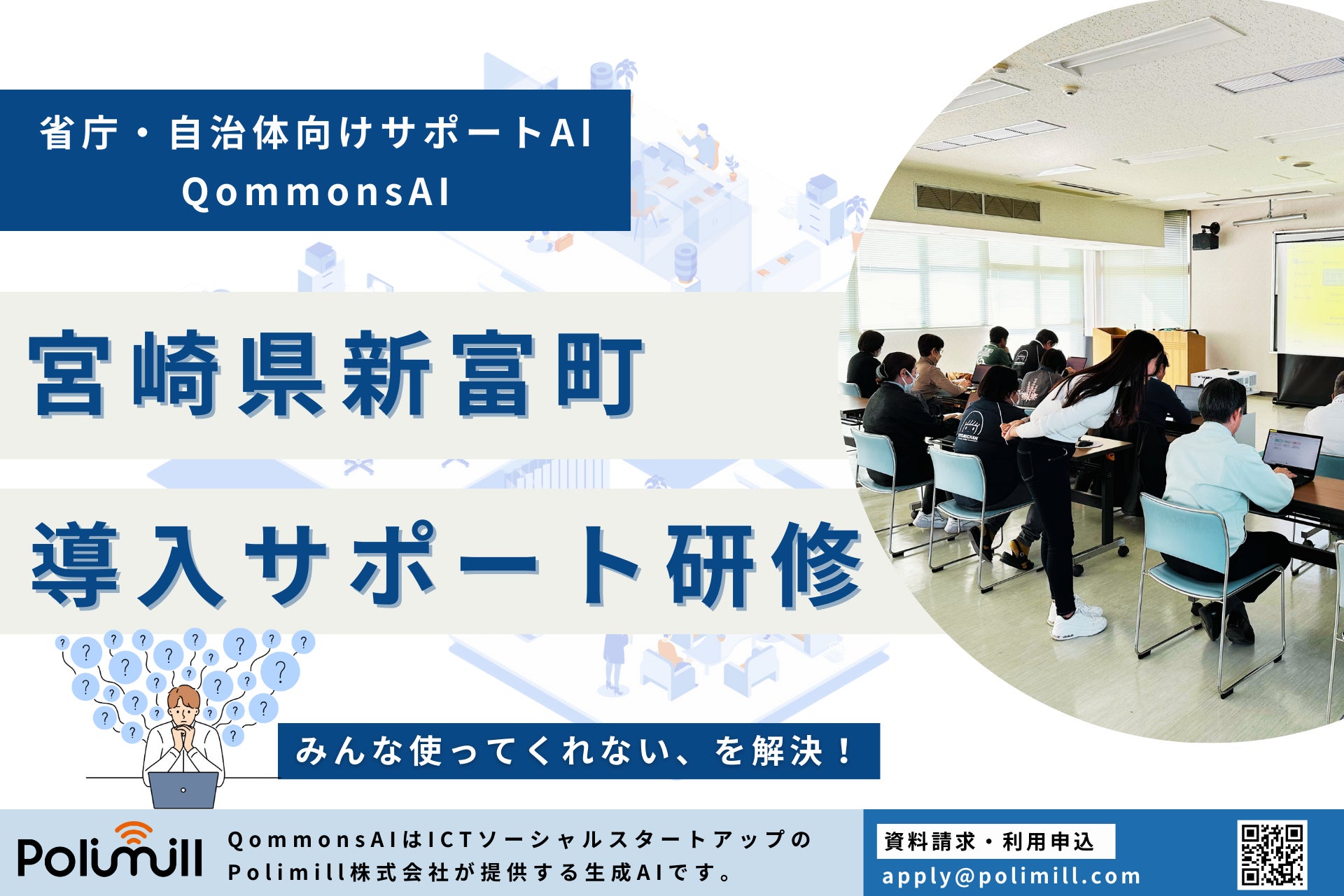 生成AIの社会実装をリードするPolimill株式会社(本社:東京都港区、代表取締役:横田えり)は2025年2月4日に宮崎県新富町にて省庁・自治体向けサポートAI「QommonsAI(以下、コモンズAI)」の導入サポート研修を実施しました。