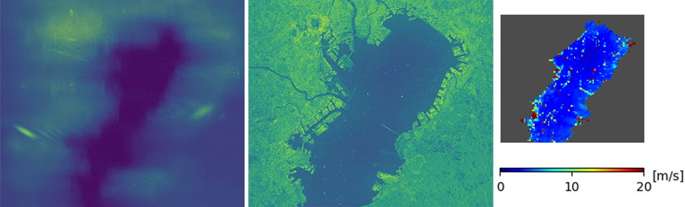 これらの技術を活用することで、衛星を模した20W以下の消費電力のシステムにおいて、SAR衛星で取得された生データから、演算量の多いL1、L2処理を準リアルタイムである10分以内に完了させることに成功しました。具体的には図2のように、地上からのレーダー反射波の強度の時間分布から、圧縮処理、補正処理、風速を推定するモデルの適用を行うことで、数100mの単位で海上の風速を算出することができました。洋上風速の算出を衛星からリアルタイムに行うことで、風速が高い地点の情報を取得しすぐに通知するなどして、船舶の安全に貢献できると期待されます。