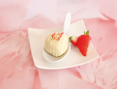 パリッとコーティングされたホワイトチョコの中には、苺(まりひめ)とピーチシロップが入っており口の中で甘酸っぱい風味が広がります。