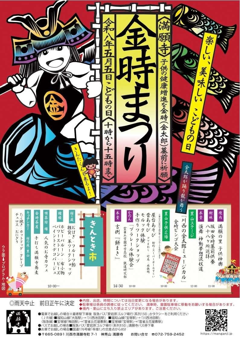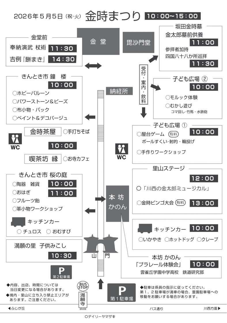 満願寺の境内や子ども広場、里山ステージでは、子どもたちによる子供神輿や、ミュージカル「川西の金太郎」の公演、昔あそび、屋台あそび、ビンゴ大会、プラレール、モルック体験など様々な催しを開催します。また、飲食、野菜、雑貨販売の「きんとき市」、キッチンカーも出店してまつりを盛り上げます。