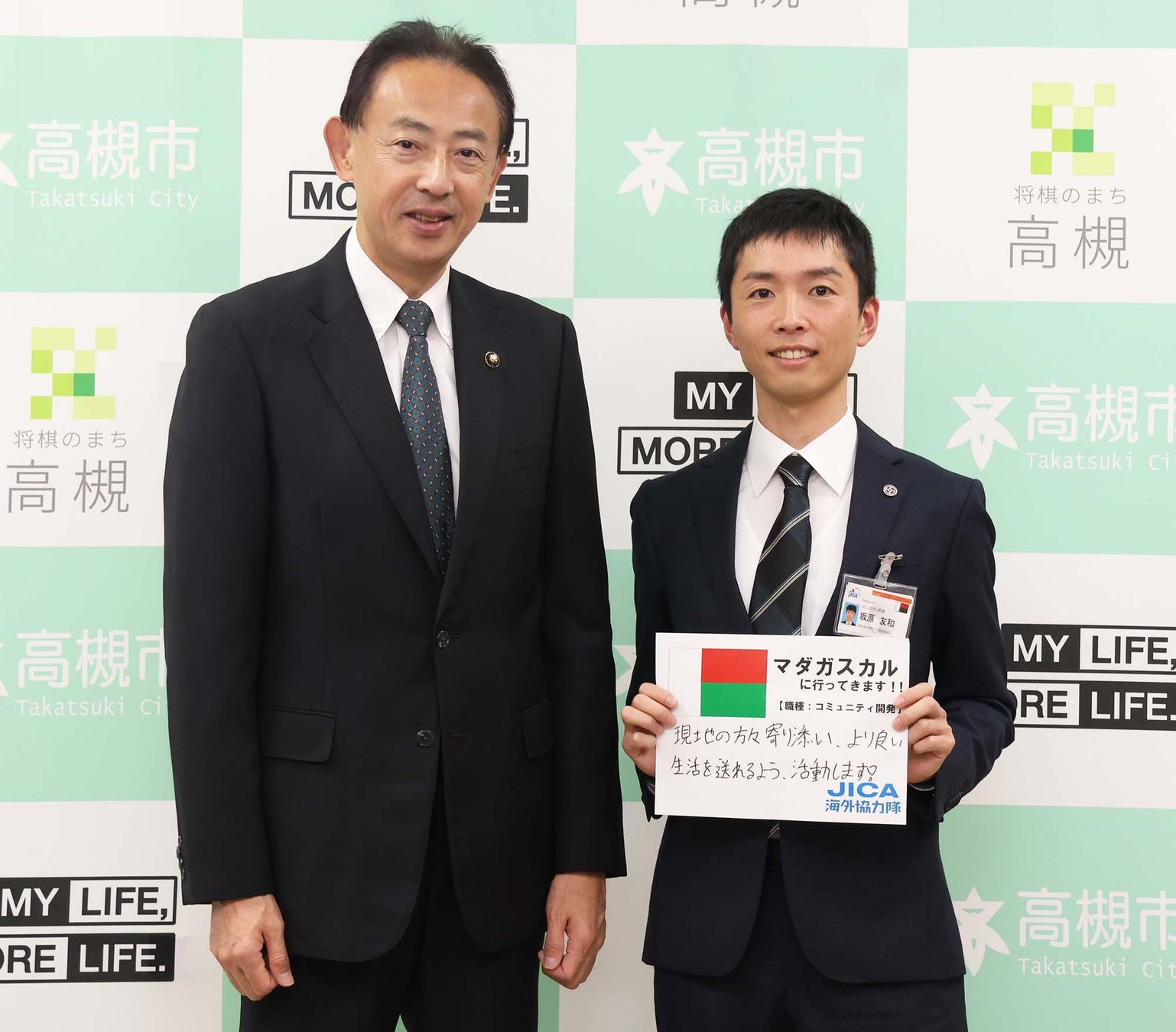 令和6年11月7日(木曜日)、高槻市在住の坂原友和さんが高槻市役所を訪問し、JICA(独立行政法人国際協力機構)の青年海外協力隊として、令和6年11月から令和8年11月までマダガスカルに派遣され、農作物の販路拡大など農家の収入向上に関する支援や住民の生活改善を目的とした生活実態の調査を行うことを濱田市長に報告しました。