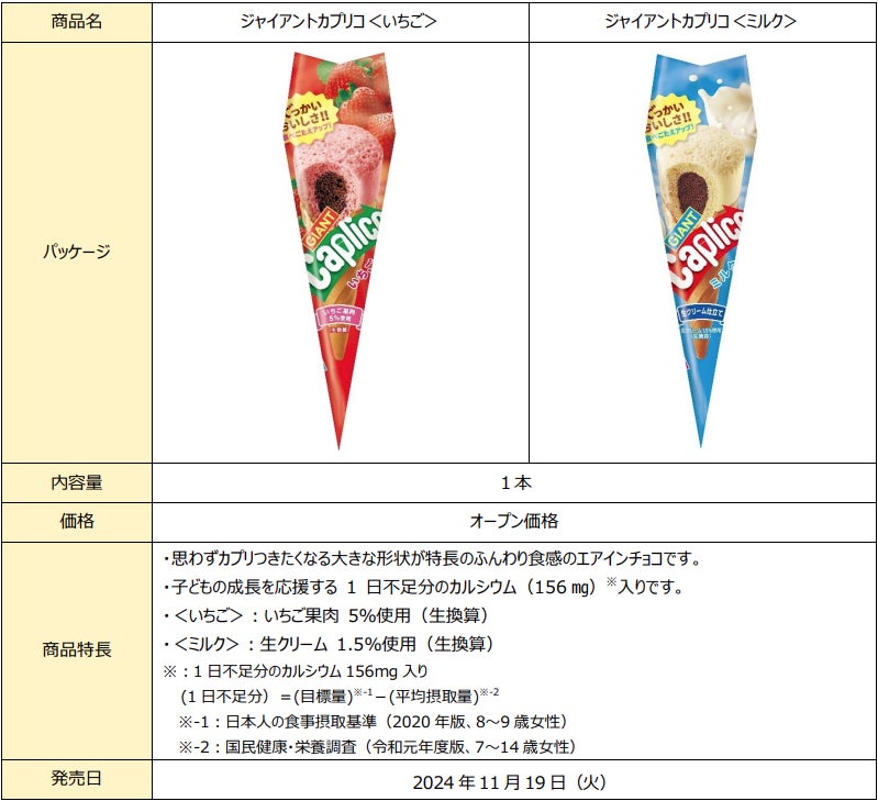 「ジャイアントカプリコ」は、2024年3月、お子さまの元気な成長を願い<いちご>と<ミルク>のカルシウムを増量しました※2。また<いちご>は、素材本来のおいしさを味わってほしいという思いから、いちご果肉を使用しました※3。
