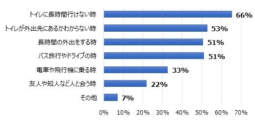 2位「トイレが外出先にあるかわからない時」(53%)、3位「長時間の外出/バス旅行やドライブの時」(51%)