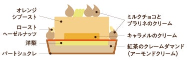 当ホテル人気の焼き菓子、キャラメルポワールをタルトにアレンジ。洋ナシ、キャラメルクリーム、オレンジシブーストを重ねてカラメリゼしました。甘さと香ばしさの余韻が楽しめます。