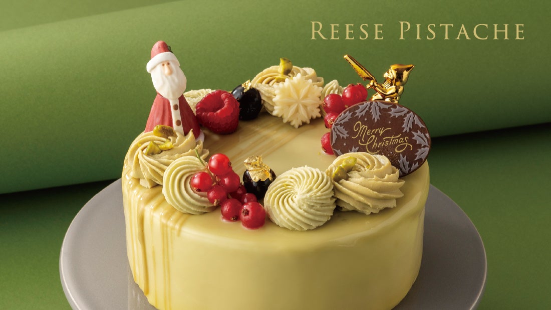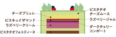 クリスマスリースをイメージし、楽しげにデコレーションしたチーズケーキ。ピスタチオ×マスカルポーネチーズのムースにダークチェリーのコンポート、甘酸っぱいラズベリーが絡み合います。