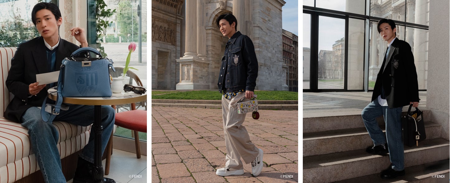 本編では、2025年春夏 メンズコレクションより、アイコニックな「ペカン(Pequin)」のストライプのTシャツに「フェンディ クレスト(Fendi Crest)」が施されたブレザーを合わせた、スポーティかつエレガントなスタイルや、カラフルな「フェンディ クレスト」のモチーフがプリントされたシャツにデニムジャケットを合わせたカジュアルなスタイルなど、様々な表情を見せています。また、日本のキャラクターアーティスト、タロアウト(Tarout)とコラボレーションしたコレクション 「シルヴィア・アンド・ザ・バゲット(Silvia and the Baguette)」のイラストが描かれた、「バゲット ソフト トランク(Baguette Soft Trunk)」を身に着け、ミラノの美しい街の中を散歩する様子が収められています。