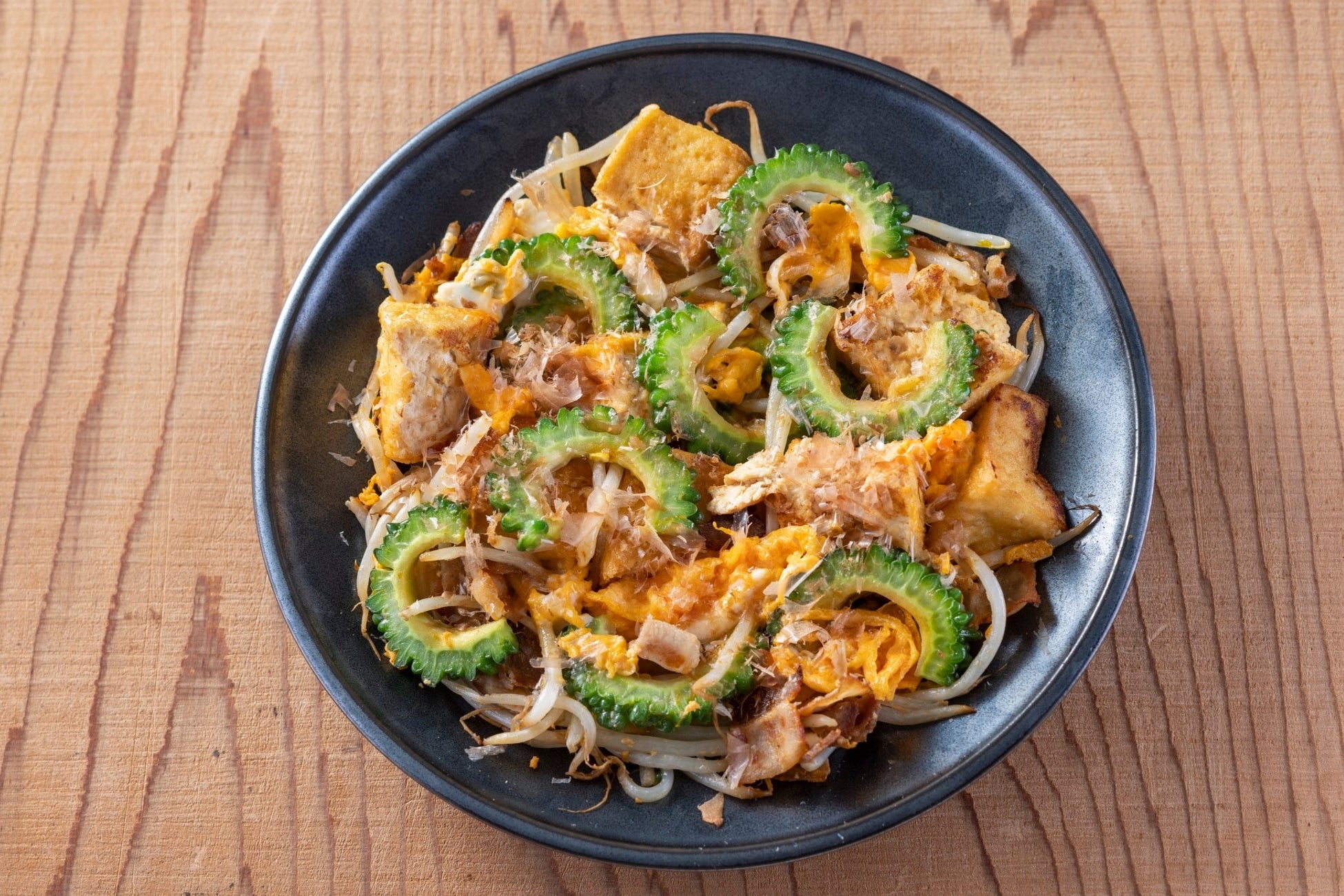 宮古島のエイトファームから届くトゲトゲが自慢のゴーヤを使用しています。ゴーヤ本来の苦みを活かすため、あえて塩もみや下茹でをせずに調理しています。