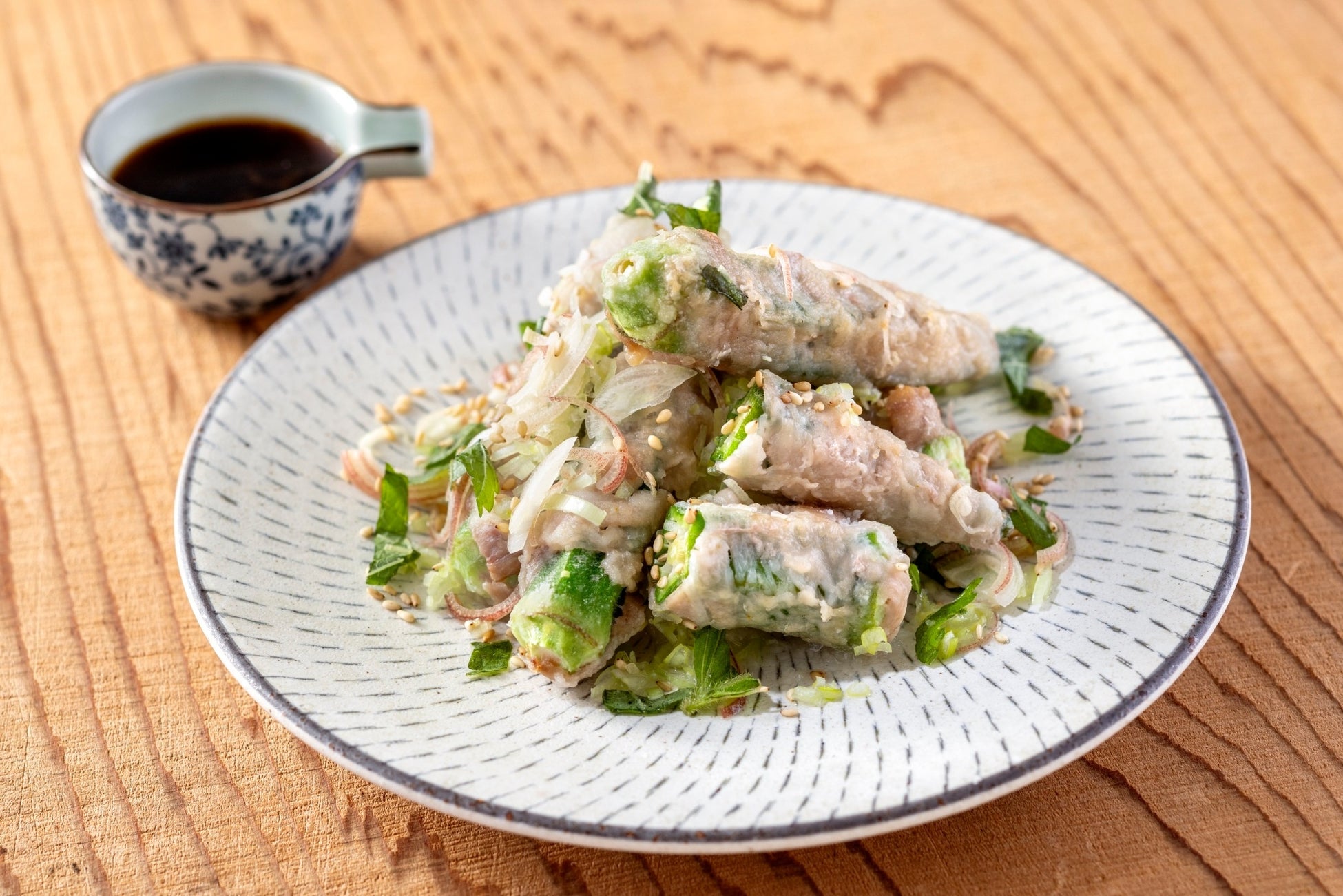 宮古島の檬果家から直送されるオクラを豚肉でまき、ポン酢ベースのさっぱりとした薬味ダレを添えました。